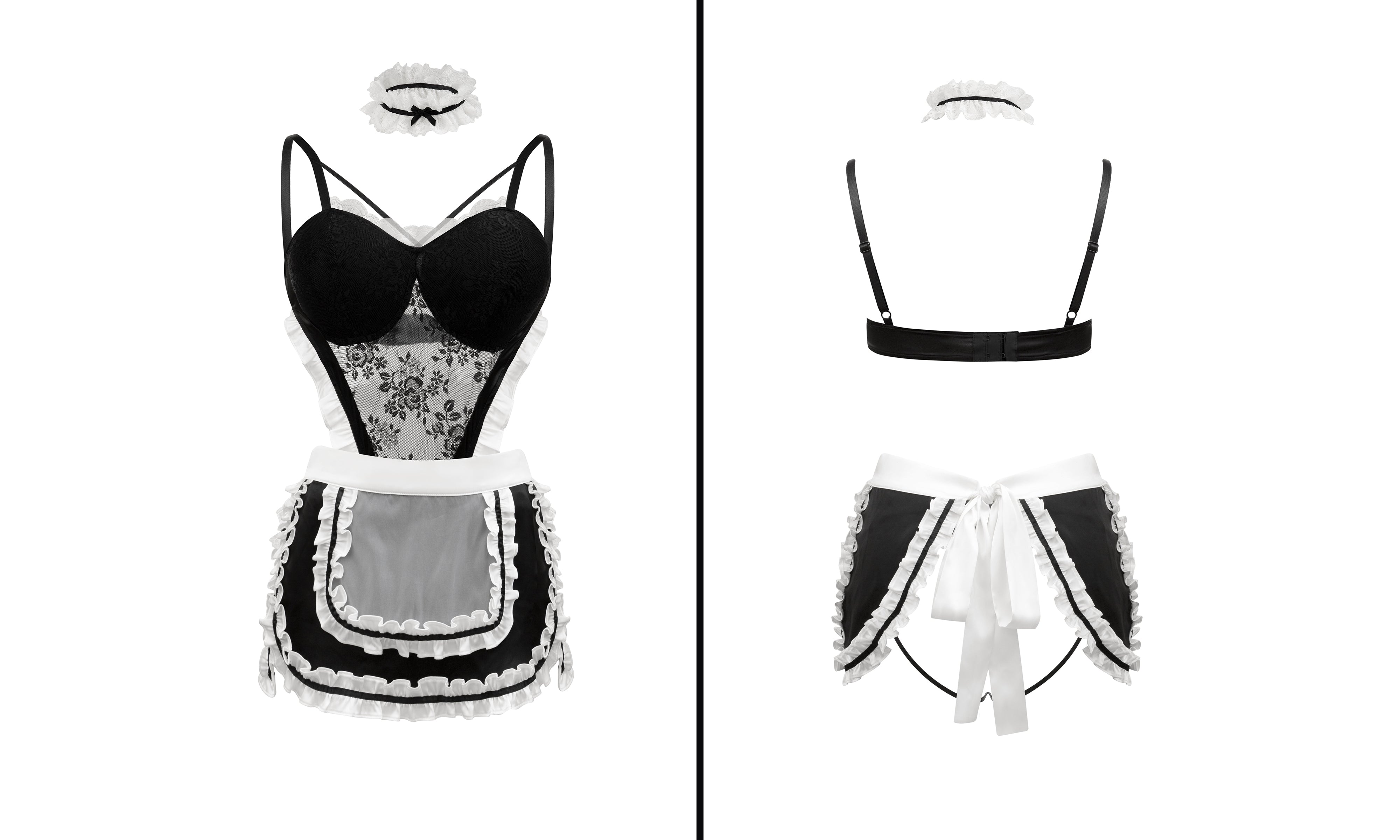 This lace corset maid lingerie set is designed for instant role shift. Structured black lace shapes the body, while sheer panels and side cut-outs highlight the waist and create a clean hourglass silhouette.