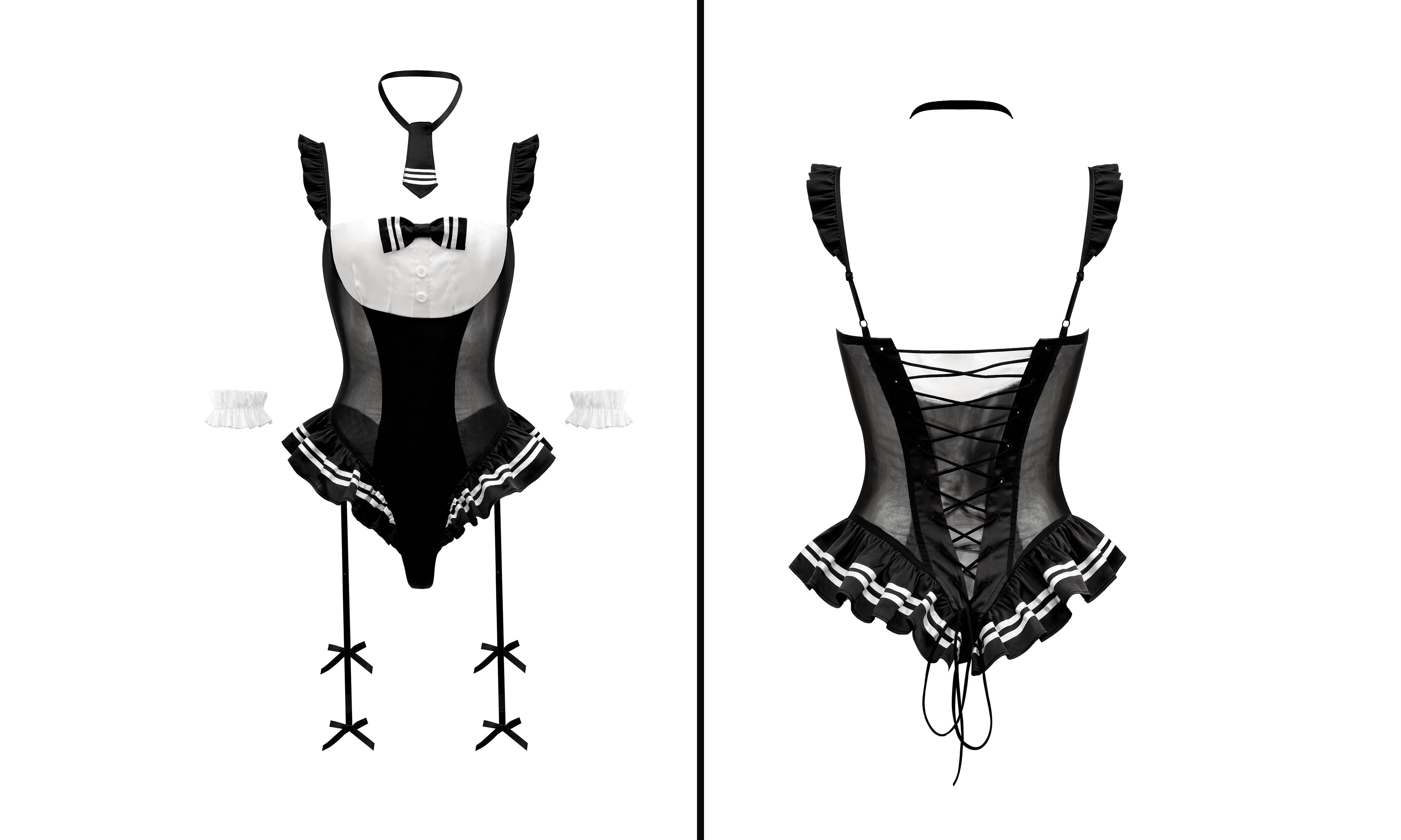 Black & White Maid Bodysuit with Sheer Panels and Bow Details - PDCP0060