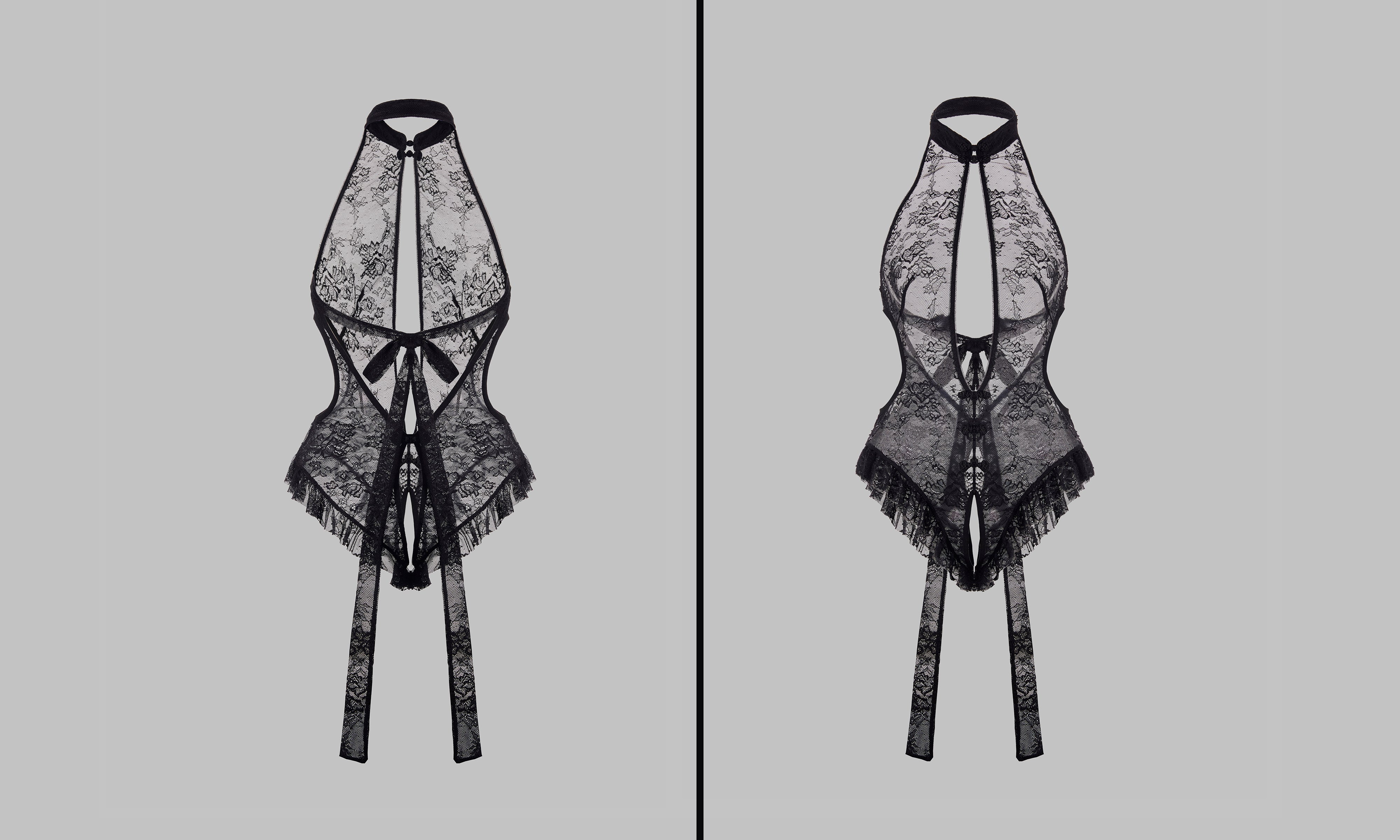 Designed to look innocent and feel anything but. The Pure Temptation Lace Bodysuit features sheer black floral lace with a daring front cut-out that traces the body from neckline to hips, creating a clean, seductive silhouette.
