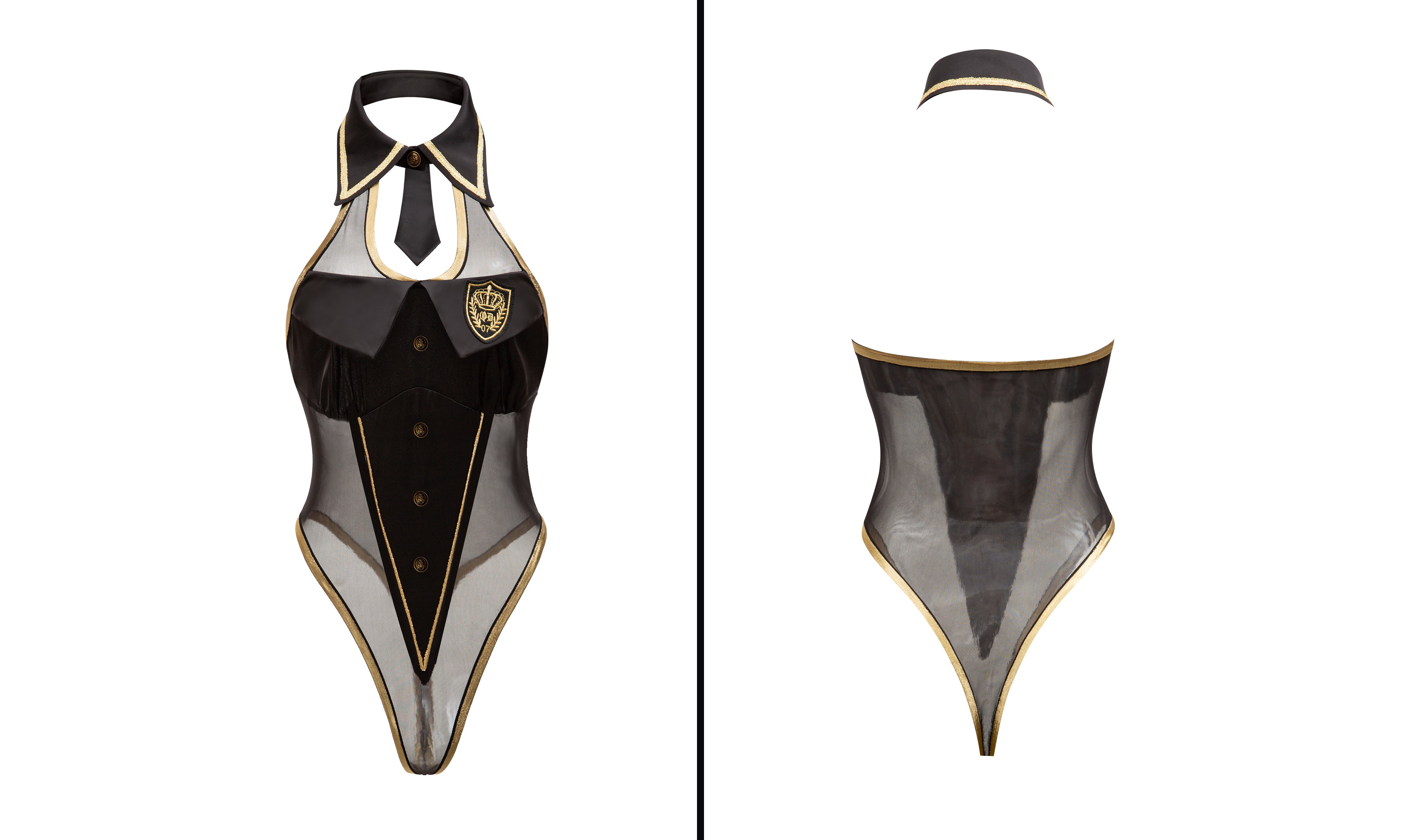Sharp collar details and subtle gold trim bring a polished, authoritative edge, while strategically placed sheer panels reveal skin with intention, not excess. Designed for confidence, control, and after-hours temptation, this bodysuit balances structure and allure in a way that’s impossible to ignore.