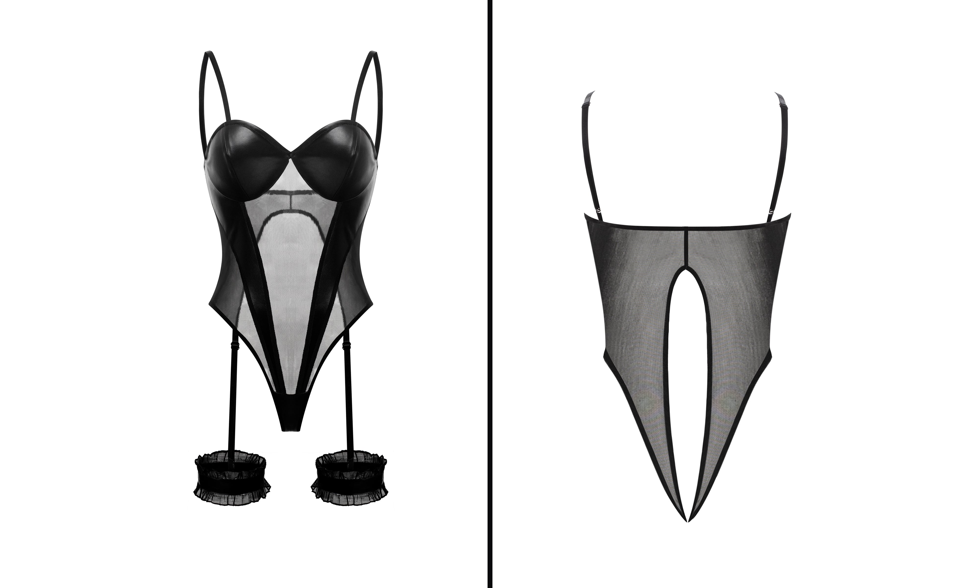 The Dark Desire Mesh & Leather Bodysuit is crafted for bold confidence and unapologetic seduction. Combining sheer mesh with sleek faux leather panels, this piece creates a striking contrast that sculpts the body while revealing just enough skin to tease the imagination.