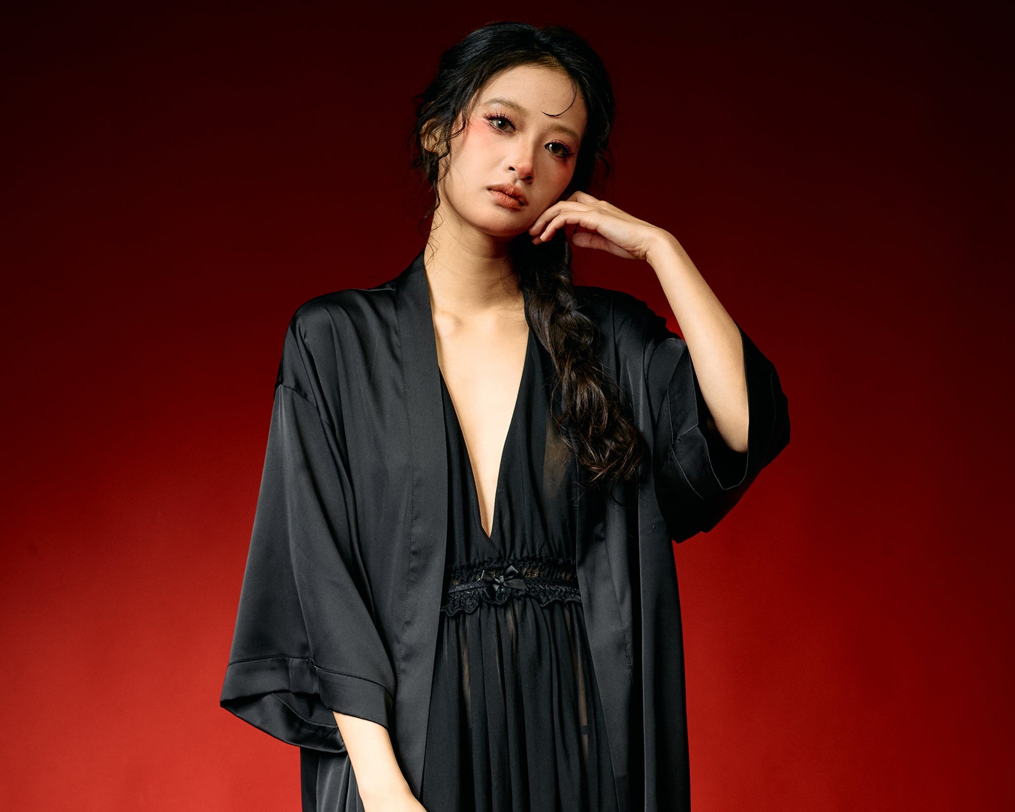 Ethereal Satin Black Lace Nightdress Set