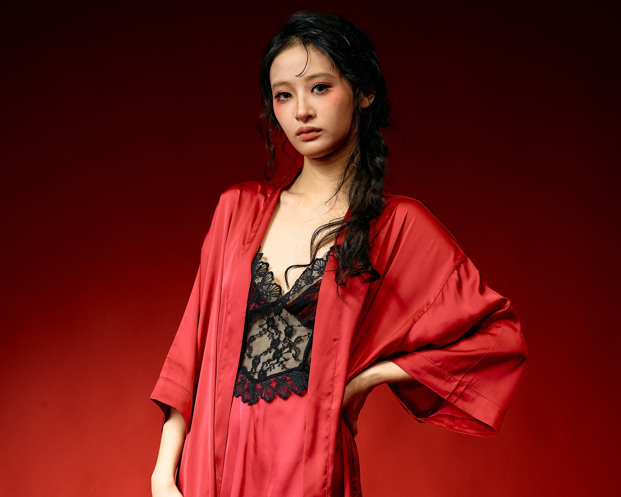 The Red Noir Lace Nightdress Set combines the richness of deep red satin with the bold contrast of delicate black lace. The flowing nightdress features refined lace and embroidery details at the bodice, creating a flattering and feminine silhouette. Paired with a lightweight matching robe, this set offers both elegance and versatility for evening wear, lounging, or sleep.