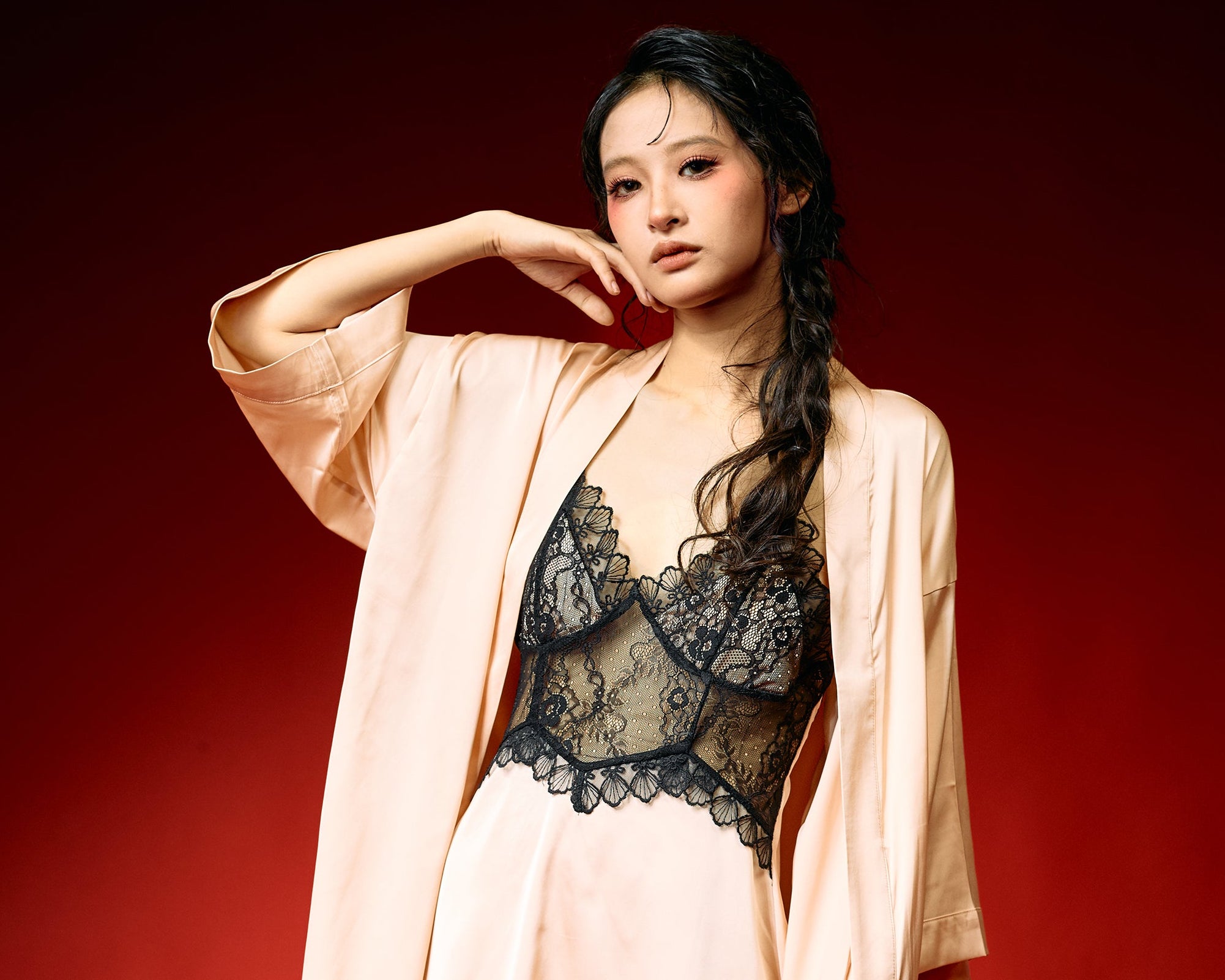 The Champagne Noir Lace Nightdress Set blends soft champagne satin with refined black lace accents for a look that is timeless, elegant, and subtly sensual. The smooth satin nightdress drapes beautifully over the body, while intricate lace and embroidery details highlight the neckline and bodice.